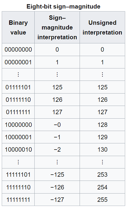 In the sign–magnitude representation, also called sign-and-magnitude or signed magnitude, a signed number is represented by the bit pattern corresponding to the sign of the number for the sign bit (often the most significant bit, set to 0 for a positive number and to 1 for a negative number), and the magnitude of the number (or absolute value) for the remaining bits. For example, in an eight-bit byte, only seven bits represent the magnitude, which can range from 0000000 (0) to 1111111 (127). Thus numbers ranging from to can be represented once the sign bit (the eighth bit) is added. For example, encoded in an eight-bit byte is 10101011 while is 00101011.